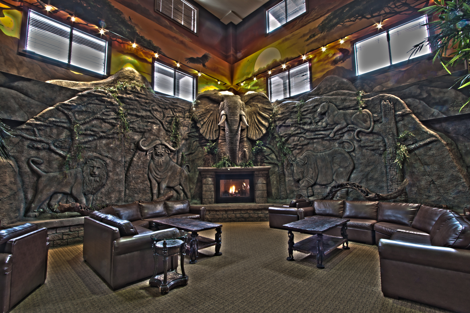 To complement the authentic decorations, the resort boasts a large fireplace in the main lobby of the Kalahari building that offers a perfect place to wind down after a long day playing at Wisconsin’s largest indoor water park. Surrounded by pby the big five animals of Africa - the lion, buffalo, leopard, rhinoceros, and elephant, guests will feel the true spirit of Africa right here in Wisconsin.